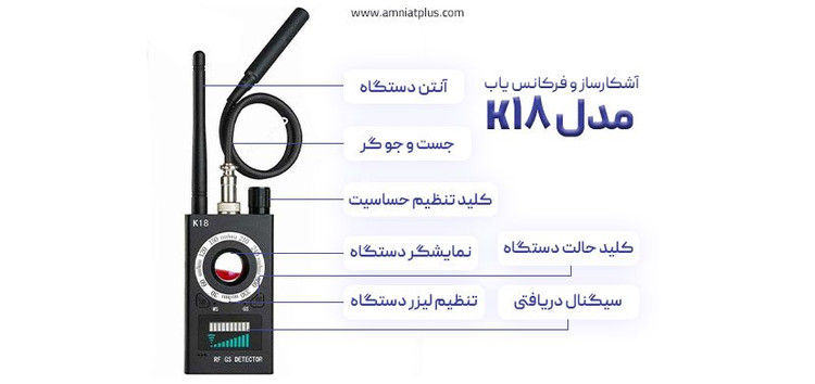 فرکانس یاب و آشکارساز لنز K18 قادر به تشخیص امواج رادیویی، تشخیص میدان مغناطیسی، دوربین سیمی یا بیسیم است. در واقع این ردیاب میتواند تمام تجهیزات مخفی و دستگاههای شنود را بیابد.